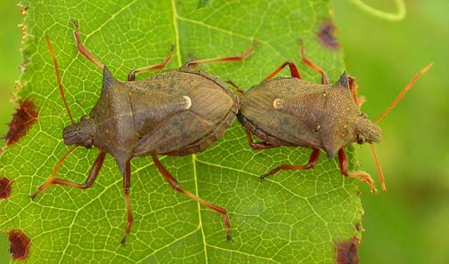 That particular stink bug wasn’t all that spiny, but here is a pair that are actually more typical of the predatory type. They look quite spiny.