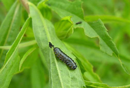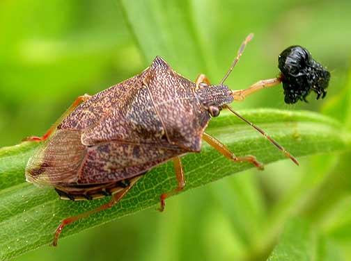 Spiny Soldier Bugs, also known as Spiny Stink Bugs, are the predatory members of the Pentatomidae Family which includes all Stink Bugs. While many species of Stink Bugs feed on plants, a number of them (mainly species of Podisus and Brochymena) use their pointed proboscis to stab and feed on the body fluids of insects (as illustrated in the gory photo above). The plant feeding Stink Bugs can usually be distinguished from their predatory kin by their lack of humeral spines (sharply pointed “shoulders”). Also, many predatory Stink Bugs have decidedly armor-like appearance compared to the smoothly rounded appearance of the plant feeders. By the way, I photographed the above Spiny Stink Beetle while it was feeding on an insect larva yesterday afternoon – I believe the little black larva was that of a Trirhabda Beetle. I’m seeing huge number of the predatory Stink Bugs around the meadows — which is probably not such a bad thing as there are immense numbers of Trirhabda Beetle larvae eating the leaves of the goldenrod plants absolutely ragged. It seems that the insect world always finds its own way to enforce balance.