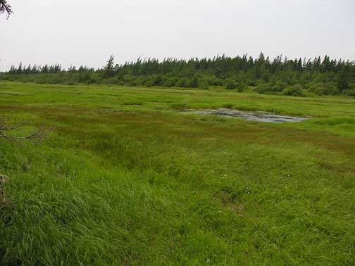 At the Baie Verte Community Center, we stopped to ask for directions to the wetland park. It turned out that we had missed the parking area which is located right across the road from the white wooden church in the middle of the village (see my previous post). The wetland area was established with the assistance of Ducks Unlimited, and contains two freshwater ponds and borders on a large salt marsh. The 2 km. long Red-winged Blackbird Trail, established in 1995, leads past the ponds and to an observation tower overlooking the salt marsh.
