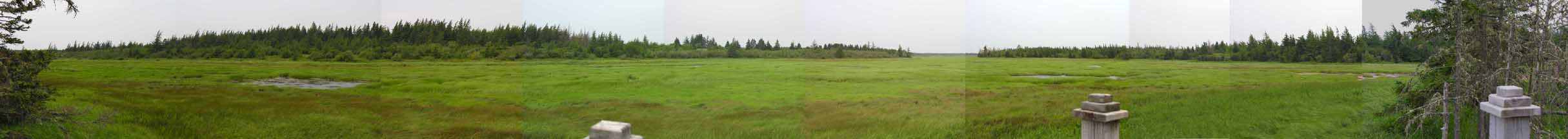 The observation platform located at the edge of a spruce forest, provides a wonderful view of a large expanse of salt marsh (see below). For a better idea of the view, check out the rough panorama that I’ve stitched together from several photos. It was extremely windy on the day of our visit, but it must be like that in that area much of the time as we noticed how the tops of the spruce trees in the forests were bent as though bowed by the wind (see photos).