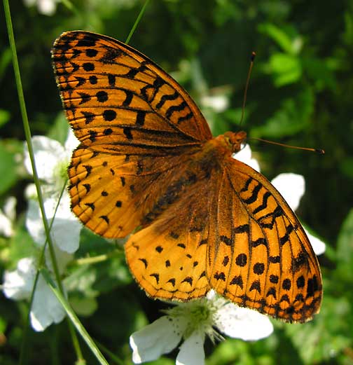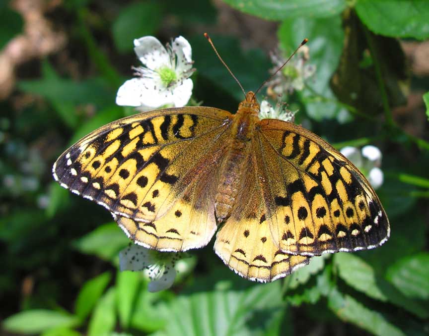 The first section of trail leads through a low area bordered by alders, blackberry, and other dense vegetation. As the path began to rise to a drier area, we found ourselves surrounded by many Fritillary butterflies that were nectaring on blackberry flowers in a small clearing. I’m not great at butterfly IDs, but I think all that I photographed were Great Spangled Fritillaries (Speyeria cybele cybele) such as the above example which looks to be a male of that species (click on image for larger view). Here are two additional photos — the first is of the underside of the above butterfly’s wings, and the second is of what I take to be a female of that species. A swallowtail butterfly was also seen nectaring on the blackberry flowers. Its wings were quite worn and damaged, but by the wider, darker markings it looks to be the Canadian Tiger Swallowtail (Papilio canadensis) and not the Eastern Tiger Swallowtail that we see in our area of Ontario. Please feel free to post a comment if you think those IDs are incorrect.