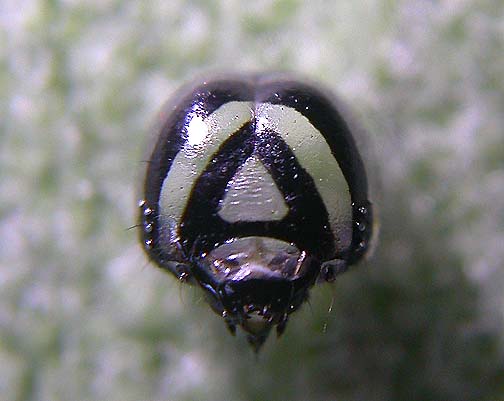 I then took a closer look at the caterpillar, and discovered that it had molted and its old “skin” was curled up nearby. I got out my camera and photographed the above through the loupe. That’s the old caterpillar head capsule — I guess you could think of it as its face. I thought I’d get a few shots of the rest of the molted skin, but by the time I finished photographing the molted head capsule, I discovered that the caterpillar was rapidly consuming the shed skin – no doubt it’s quite nutritious and high in protein. I’m quite amazed at how quickly it ate everything — probably less than a minute. However, I did notice that it left the sharp, black claws from the thoracic legs. You can see them on the leaf next to the caterpillar in this photo below.