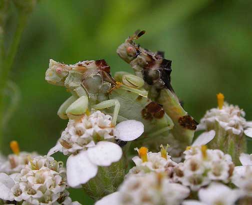 A couple of years ago, while looking around for information on Phymatidae, I came across something quite interesting. There’s a webpage by Matija Gogala, from the Natural History Museum of Slovenia, that contains some neat info on bioacoustic recordings made of Phymata crassipes. There are recordings of the vibrational songs of Phymata communicating with one another, and also a Phymata “answering” whistles made by a researcher. Just go to this page and scroll to midway down the page and you should see the section about the Phymata. In my opinion, pretty fascinating stuff. I would love to have some kind of bioacoustic recording equipment to capture such sounds as I would not be at all surprised to find that the females that I’ve seen hunting together, are communicating in some way as well.