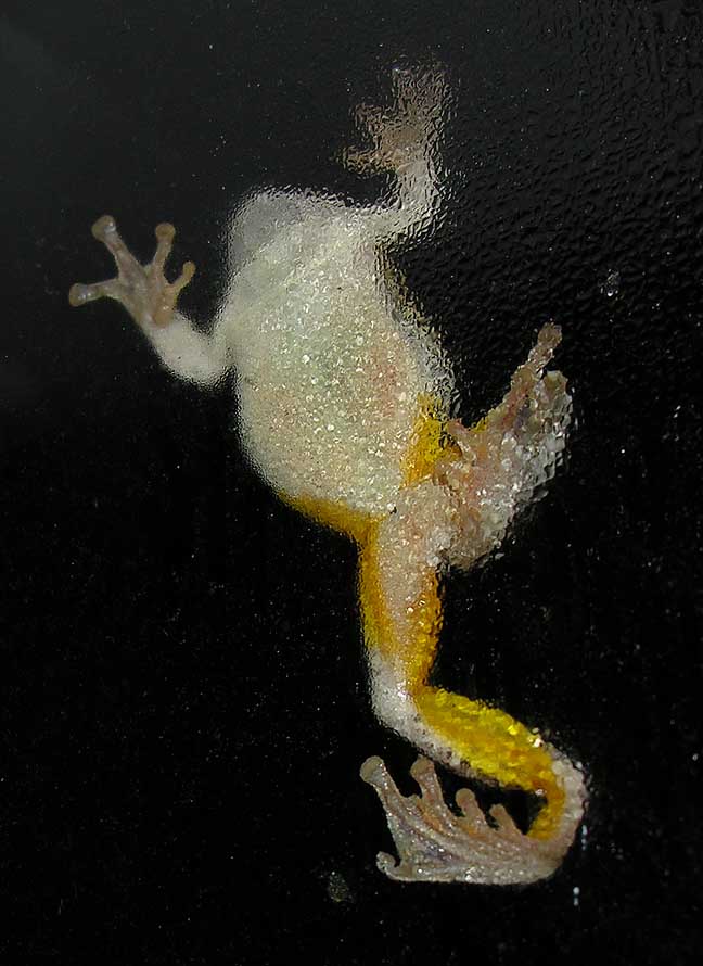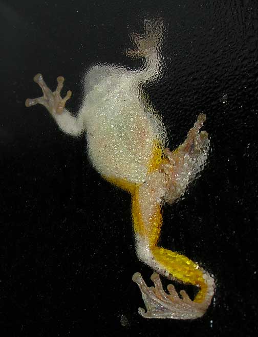 Below, I’ve posted an enlarged shot of one hind foot as I thought it might be of interest to those who haven’t watched a treefrog moving about on a windowpane. They really do have fascinating feet. The toepads grip onto all types of surfaces, including wet glass. I did a bit of searching for info on treefrog feet this morning and came up with something new that I hadn’t seen before. Here’s a link to an article in Science News Online from June 10, 2006, that describes how tree frogs are able to stick to both dry and wet surfaces. When moving over dry surfaces, the toes secrete a slightly sticky mucus film that helps to provide some wet adhesion. However, it seems that when moving over a wet or slippery surfaces, such as the wet glass in my photos, the structure of the toe pads — microscopic bumps on the surface of the pads, with mucus channels between — moves fluid so that the bumps will make the best contact with surface. Read more at the above website.