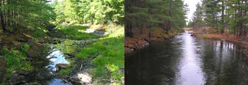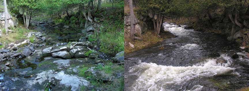 Wayne – The water is quite clear in most rivers up on the Shield it runs through granite and not much soil. However, it does tend to be a bit tea-colored, probably due to both tannins from wood residues and from mineral in the rock. I’m planning to get around to a few other creeks and rivers before freeze-up to get some shots of high water conditions for future reference, so I may be posting some more of these comparison sets.