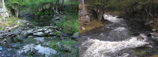 Above and below are pairs of photos taken from similar vantage points at two favourite spots along the creek. The above shots were taken looking upstream from the footbridge not far from the McParlan House cabin. The one on the left was taken on Sept. 18, 2005, and the one on the right was taken yesterday, Nov. 4, 2006. The lower set of photos are looking upstream from a vantage point on Black Ance Road. The angle is a little different, but the similarity of location should be apparent.
