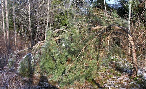 Wayne – The damage that a heavy ice buildup can cause never ceases to amaze me. A couple of the things that I’ve noticed after watching trees break up after an ice storm is that they often seem okay if we just get some ice and a thaw, but if we get heavy snow, and/or especially if the temperature drops quickly, the trees really start to break apart. I’m sure there’s a good explanation for why this would be so. As mentioned in my earlier post on the ice storm, when we get those particular conditions, the trees make horrible cracking sounds like gunshots. I think the wood practically explodes as it becomes brittle as the temperatures fall. That does seem to make sense to me as wood behaves quite differently in very cold weather. For example, in deep winter, it’s quite easy to break off branches with your bare hands — ones that you couldn’t break in summer as the wood would be too flexible. Perhaps that’s why ice storms seem to do such incredible damage when they occur up here where they aren’t really that common (or at least, didn’t seem to be until recently). Btw, now that we’re doing this tree measuring thng, there are 2 forest that lies south of here about 60 miles that we’ll visit sometime this winter. Both have some fairly large, old trees. Awhile back, I noticed that a number of the oldest trees in both forests have badly deformed crowns – often having two tops instead of one, but you can tell that this happened ages ago. I’m guessing that they were damaged during an ice storm a long while ago.. perhaps 150 years ago. If I can measure some of the damaged ones and also the somewhat smaller trees that surround them, it might be possible to calculate a possible date for the storm.