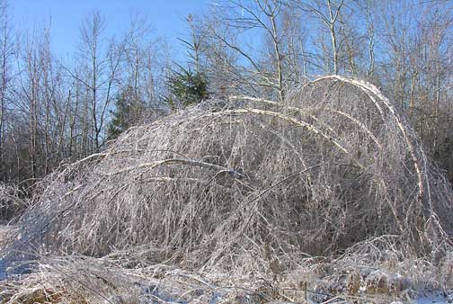 Laura – I’m not sure if there would be a way to prevent this kind of ice damage. Certainly, the more branches a tree has (especially branches with many small twigs like the birch), the more ice it will accumulate, and the greater the weight of the canopy. I suppose reducing the number of branches might help to keep the upper part of the tree light. I guess the only drawback might be that the tree might loose some of the remaining branches and you would be left with a very scraggly tree with few branches and leaves. With larger trees, I doubt there’s a way to prevent damage. During the ice storm of ’98, I heard an interview with an arboriculturist who said that very large trees were carrying huge weights.. sometimes a couple or more thousand pounds of ice in their upper branches, so it wasn’t surprising that whole sections of trees were breaking away and crashing to the ground. At the back of our land, there are a bunch of huge Manitoba Maples. The canopies got so loaded with ice that the trees tore loose from the soil and tipped over on their sides. Very bizarre. There are many trees like that in forests up here now, and I suspect a good number of them fell over during the ’98 storm.