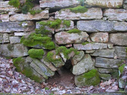 Just a short distance beyond the beaver dam, there’s a short side trail that leads to the lime kiln for which this trail is named. There are quite a lot of these scattered over the countryside. If you’re not familiar with the term, here’s a bit of info. The one in the above photo is just the simple kind that is usually found on homesteads in this region. The one at Mill Pond would most resemble a smaller version of the drawing on this page (look most of the way down the page). The kiln at mill pond is about 3 meters (10 feet) in diameter. This is how it looks when viewed from above.