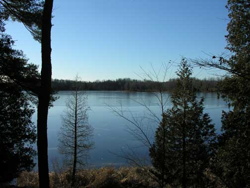 Yesterday, I said I’d put up something nice for those who didn’t appreciate the post about spiders, so consider this to be it. About a week ago, we spent a couple of hours hiking the Lime Kiln Trail at Mill Pond Conservation Area which lies a few miles south of Smiths Falls. I shot quite a few photos that day – perhaps the most I’ve taken in one day in awhile. The circumstances were unusual for mid-January. No snow on the ground and just the slightest film of ice forming on most of the larger ponds and in the roughly horseshoe-shaped shallow lake that loops around much of the conservation lands. The above photo is a view of one section of the lake. In summer, we occasionally paddle our canoe around the shoreline of the lake and into a couple of very shallow bays populated by the bleached stumps of long submerged trees. We can easily spend 2 or 3 hours paddling and then drifting here and there while I photograph dragonflies, waterlilies and other interesting things. Actually, I just checked and see that I wrote about paddling there on July 30th, 2006.