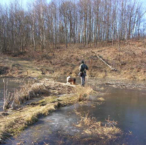 Continuing further along the trail, we came to the low beaver dam over which the hiking trail passes. Sabrina and Don headed out across while I shot a few photos (see above). However, Sabrina stopped in her tracks a split second after I shot this photo. There was water moving through the sticks as the pond level was much higher than would usually be seen at this time of the year. She paused for a moment and then retreated, leaving Don standing on the dam trying to decide what to do. I called out that maybe it wasn’t safe as Sabrina is pretty savvy about such things. However, Don decided to forge ahead on his own. A moment after I shot the prevous linked photo, Don also decided that the path over the dam was too risky after some stick shifted and sank. In mid-January, slipping and falling into freezing water while out on a trail is not worth experiencing, so we decided to circle around downstream following a trail probably made by the deer and beaver that frequent this area. It made for a nice detour as the stream was still open with water flowing over rocks before emptying out into the larger pond we had passed earlier in our hike.