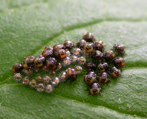 This morning, I remembered to look for the silver eggs that I saw being laid by a predatory Stink Bug on June 7th. Lucky thing that I did as the eggs must have just hatched out. A tiny mass of bugs could be seen clinging to the eggs – they’re probably still at the first or perhaps second instar stage. At this point, they would be vulnerable to predation by other insects, but it won’t be long before they’ll be on the prowl looking for prey of their own. This University of Florida page on Spined Soldier Bugs mentions that these bugs are high cannibalistic, so I imagine they may dine on each other until they are large enough to strike out on their own. Unfortunately, I don’t know if these fellows just hatched, or if they were out a day or two ago as I hadn’t been able to find the eggs until this morning — the vegetation has grown so much that it was concealed from my line of sight. I doubt they’ve been out of the eggs for long though as they are piled up atop them. As they get older, they’ll move to rest side by side and do some roaming around on the leaves. I’ll try to watch them more closely for the next few days to see how long it will be before they disperse. I didn’t think to count the insects, but next time I pass by, I’ll take my loupe and see if I can figure out how many their are on the leaf. Perhaps I’ll be able to tell if their numbers diminsh before they wander off.