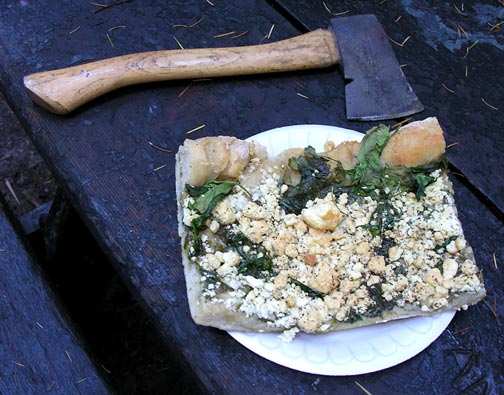 Turned out, we weren’t the only ones to enjoy the foccaccia. While we were sitting by the fire, someone discovered and snagged the remaining slices of the blue cheese foccaccia sitting on the picnic table behind our backs. It was a white cat — without any doubt, one of the four somewhat feral kittens that we discovered hanging out in the bushes behind last year’s campsite. Of course, we figured that they wouldn’t fare too well in the coming winter. Not so, it seems. By the end of last evening, we had established that at least two of the kittens – now grown into cats – are inhabiting the bushes around the campsites. Obviously, they’re a lot more resourceful than we might have guessed.
