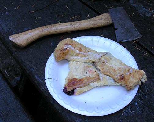 We were hoping to score some of the very fine Blackberry Turnovers that we enjoyed so much last time through the area (see above). Indeed, we did stock up on a few, along with some other choice items – two kinds of foccaccia – one with tomatoes, olives and thinly sliced lemon, and another with blue cheese and basil leaves (see below). Wow! We were feeling well-provisioned as we continued north into the redwoods. That evening, after setting up camp at Richardson Grove, we placed slices of the foccaccia on foil next to the fire and let them bake a short while. Mmm…..life was seeming to be pretty good.